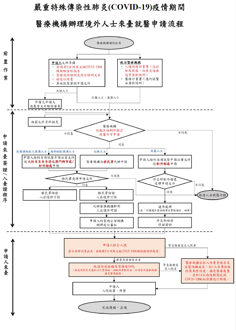 Considering that the epidemic situation in Taiwan is currently stable, and that there is sufficient health care capacity in Taiwan, these Directions have been formulated with a view to continuing the spirit of “Taiwan can help, and Taiwan is helping!” Member institutions of Taiwan Task Force for Medical Travel wishing to assist foreign nationals in seeking medical care in Taiwan, shall handle applications for entry to Taiwan by international patients and medical services for international patients in accordance with the provisions of these Directions and the necessary epidemic prevention measures announced by CECC.
