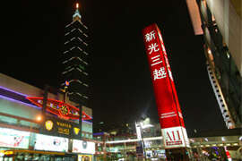The four branches of XINYI PLACE (Shin Kong Mitsukoshi Department Stores), each luring a specific customer base, are located between Songzhi and Songren Roads and connected by a skywalk to neighboring malls (including TWTC) in a cityscape that punctuates the latest fashion, particularly when neon-lit in the night. |