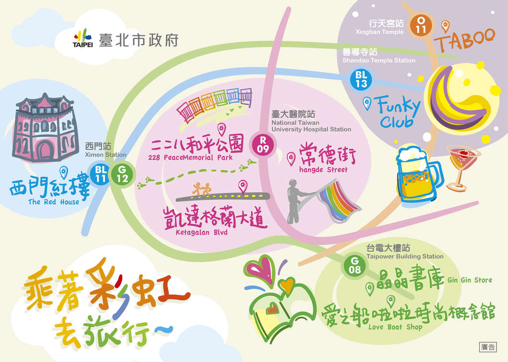 Located between the Presidential Office Building (a national historical site that was formerly the Office of the GovernorGeneral during the Japanese Colonial Period) and Jingfu Gate (also a national historical site and previously the eastern gate of Taipei City during the Qing Dynasty), Ketagalan Boulevard has always been a popular venue for social movements and protests. It is also the meet-up location and starting point for the Pride Parade. Significant locations such as 228 Peace Park (formerly New Park), Changde Street, and Ximending are also nearby. Once these places were sites of slander and repression of LGBT groups; now they have become public platforms where LGBT individuals gather and fight for equal rights.