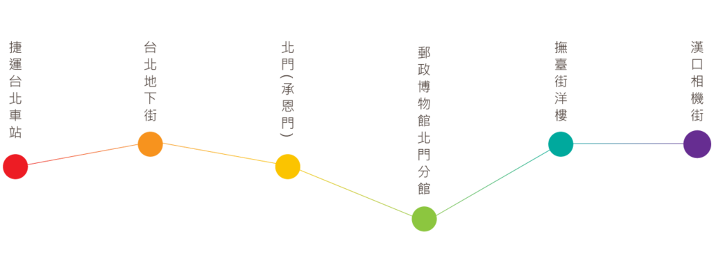 台北地下街能满足不同旅客的需求,美食、电子、百货、服饰等应有尽有,周未假日人潮更是车水马龙。过去台北城也座落於此区,现今仅存的古城门─北门(承恩门),可遥想当年台北城的巍峨,与北门遥望着的为台北邮局,外墙除使用洗石子外,并采用由北投窑厂所产的浅咖啡「防空色」小磁砖;北门邮局对面抚台街洋楼,是座两层楼石木混合构造建筑,深受欧陆古典风格的影响。附近的汉口街则是台北着名的相机街,也不容错过。
