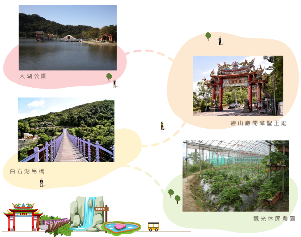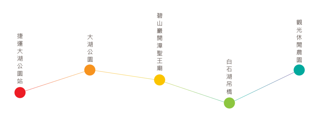 捷运大湖公园站旁的大湖公园内,有锦带桥、垂柳、凉亭等中国风的建筑与湖光景色相辉映,因此有着「台湾小西湖」之称,非常适合漫步赏景。而喜爱大自然的朋友也可到碧山一带造访观光休闲农园,体验不同季节的采果乐趣。碧山上的碧山岩开漳圣王庙居高临下,香火鼎盛,站在庙前平台可见蜿蜒的淡水河、鲤鱼山及梯田等,而夜间时台北101大楼、圆山大饭店等夜景之美尽收眼帘;而邻近的白石湖有台北市第一座大跨距的吊桥-白石湖吊桥,独具一格的新设计,采龙骨意象形塑,融入山区的大自然美景。