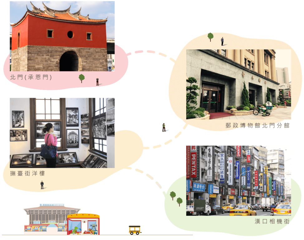 台北地下街能滿足不同旅客的需求,美食、電子、百貨、服飾等應有盡有,週未假日人潮更是車水馬龍。過去台北城也座落於此區,現今僅存的古城門─北門(承恩門),可遙想當年台北城的巍峨,與北門遙望著的為台北郵局,外牆除使用洗石子外,並採用由北投窯廠所產的淺咖啡「防空色」小磁磚;北門郵局對面撫臺街洋樓,是座兩層樓石木混合構造建築,深受歐陸古典風格的影響。附近的漢口街則是台北著名的相機街,也不容錯過。