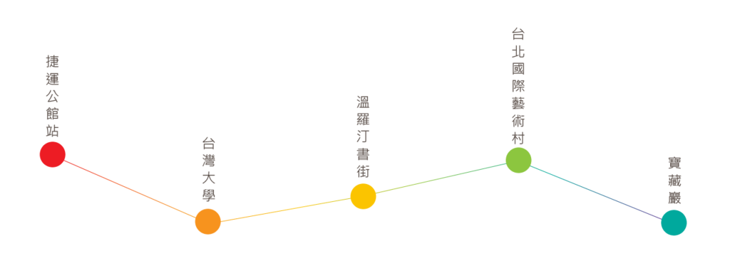 台灣大學,前身是於1928年創立的「台北帝國大學」,因學生眾多,進而帶動校園周邊發展出商圈、書街。其中溫州街、羅斯福路、汀州路一帶,因教師與學生的需求,慢慢匯集成歷史悠久的書店聚集地,又稱「溫羅汀書街」。這裡散落著各種風格的書店,像是人文書店、女性與同志書店、學術專門書店、宗教類書店、二手書店、旅遊書店等,盡是書香薰陶的氣息。而附近還有台北國際藝術村-寶藏巖,位在公館新店溪水岸旁的小山丘上,以「聚落共生」概念引入「寶藏家園」、「駐村計畫」與「青年會所」等計劃,有許多藝文空間、具特色的彩繪牆,也時常舉辦展覽、演講、表演,成為一個「跨文化交流」的平台。