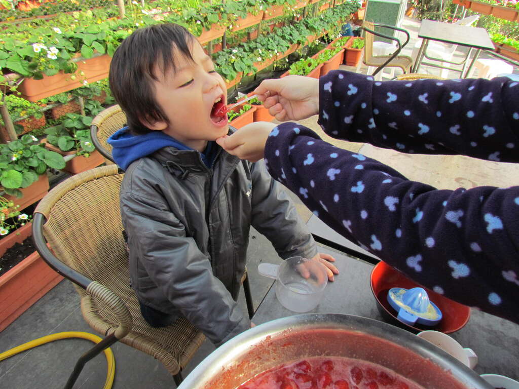 此次特別選了可以現做草莓醬的農家,讓小孩體驗一下親手做果醬的滋味,雖然之後長達近一小時的攪拌工作由大人接手完成,但這期間,小孩們也完成了採摘草莓的「壯舉」,玩得相當過癮。