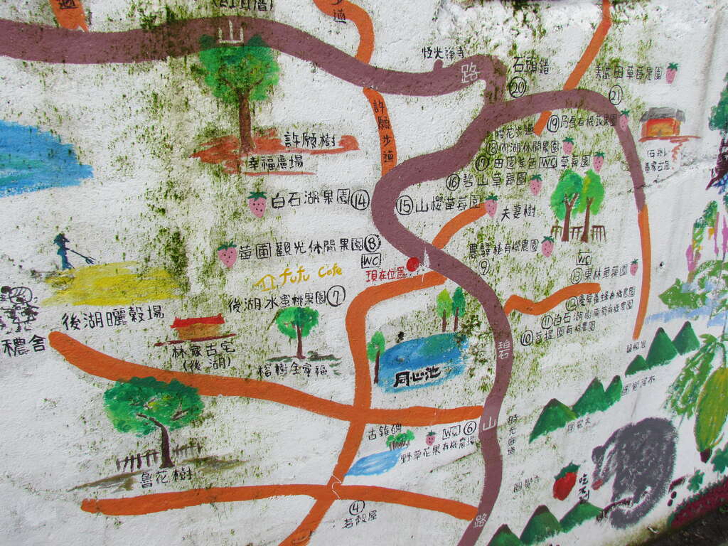 心滿意足採完草莓後,毋需急著下山,白石湖草莓園附近有許多景點值得一一探索,如同心池、白石湖吊橋、碧山巖等,且沿途都有相當多的美食,可以餵飽一早因勞動而餓扁的胃袋。尤其時逢草莓季,不少店家推出各式草莓料理,草莓果凍、草莓冰淇淋、草莓奶茶不稀奇,還有草莓香腸、草莓粿可以嚐鮮。跟著指標往白石湖吊橋走去,經過同心池後,有一家設有鞦韆和溜滑梯的親子餐廳,小孩玩翻天的同時,大人們也可得到完全的休憩。